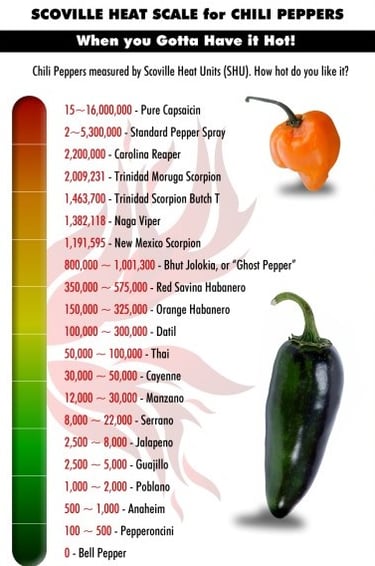 Here is a list of Scoville Heat Units (SHU) of the most common chili peppers and hot sauces so you can get an understanding of how they relate to each other.